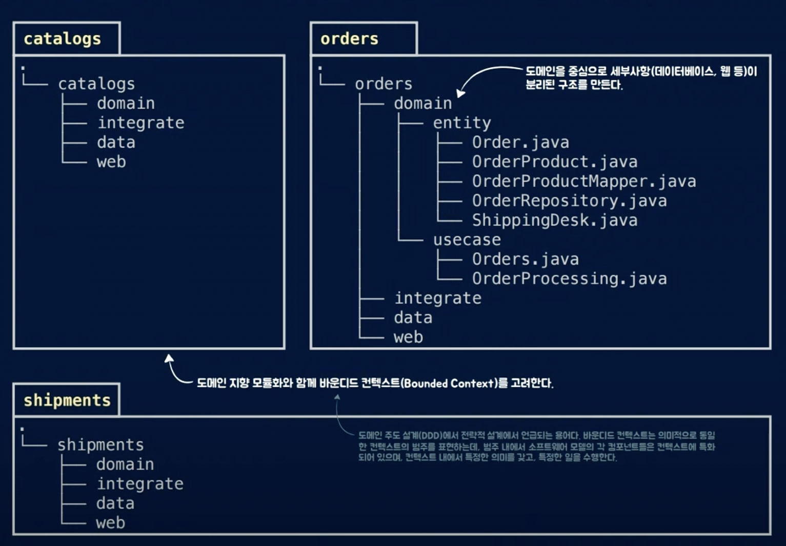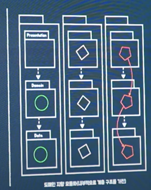 - 도메인을 기반으로 상위 경계를 치고, 그 내부를 계층의 구조로 모듈화를 한다.