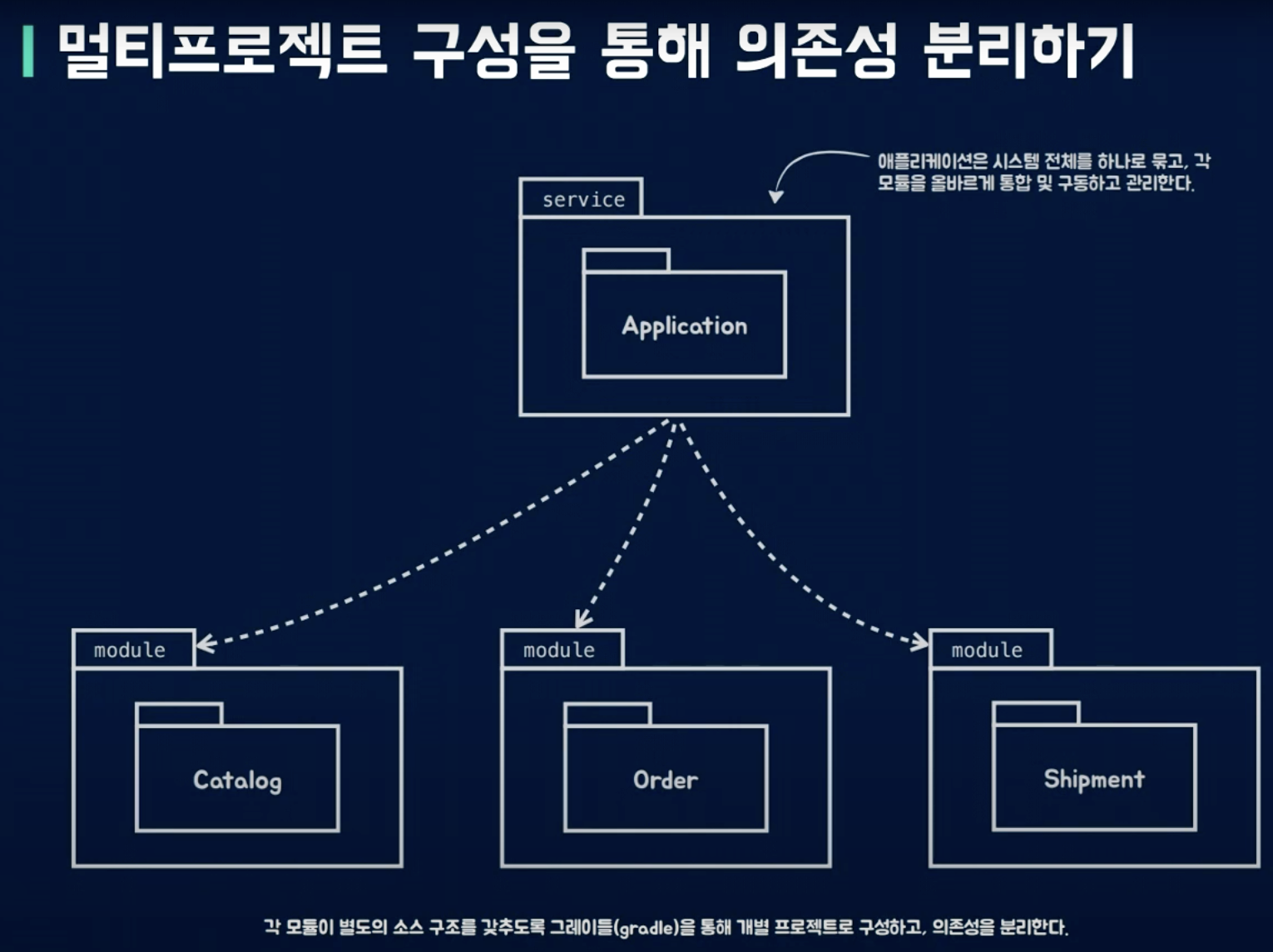 gradle 빌드도구의 도움을 받자. 하나의 저장소 안에서 여러개의 프로젝트를 나눠서 관리할 수 있다. 각 모듈별로 프로젝트를 구성한다. 이 프로젝트 간의 관계 형성 시 서로간에는 전혀 알 수 없게 만들어 버린다.