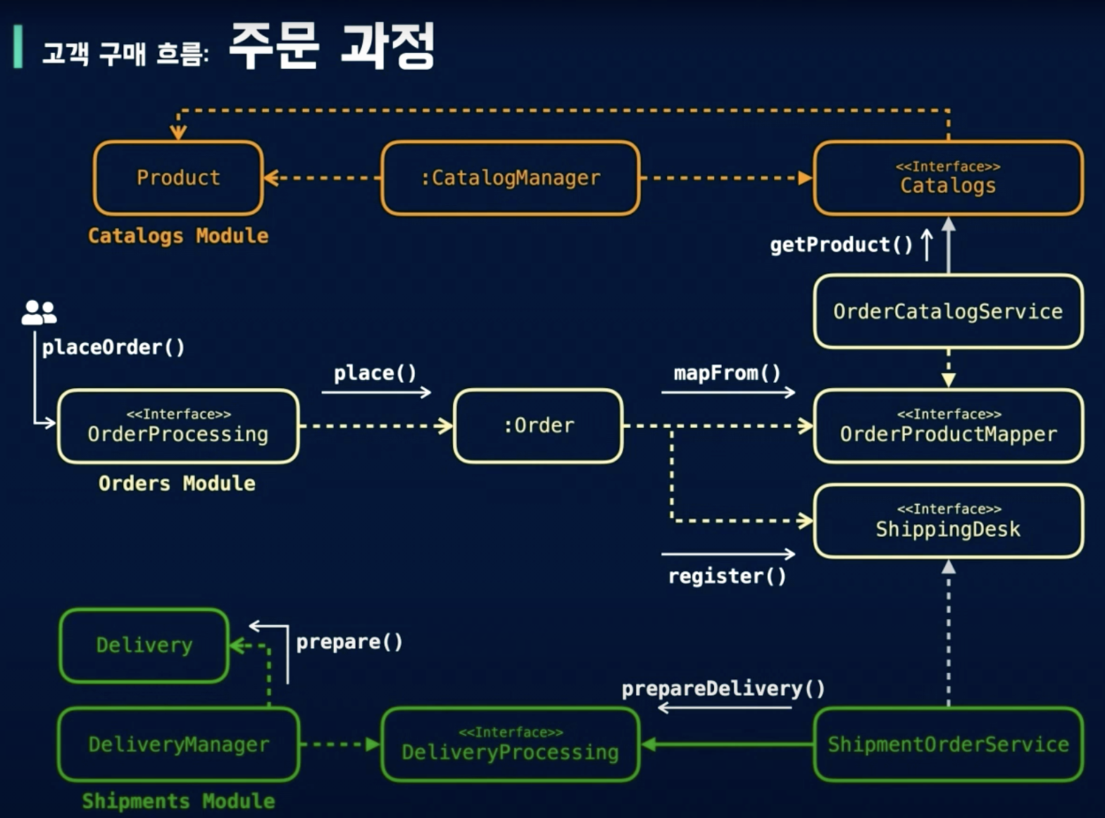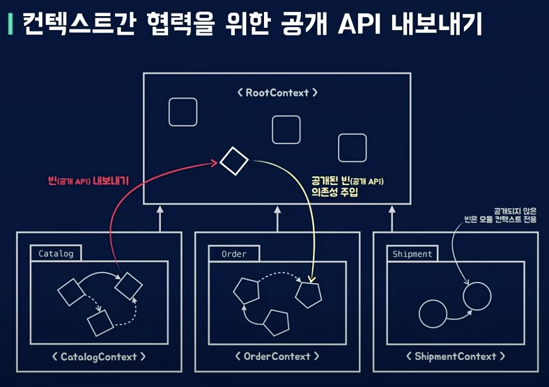 컴파일타임에서는 상품은 다른 아이들을 알 수 없다. 하지만 모듈과 모듈이 서로 협력해야하므로, 그걸 entry Application main이 책임을 져준다.