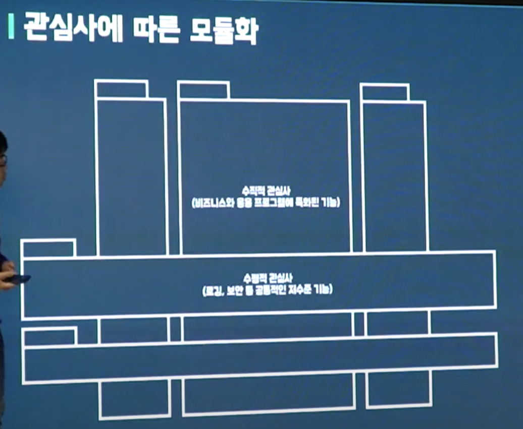 - 수평적 관심사는 비즈니스와는 무관하지만, 시스템을 만들기 위해 필요한 것 ( 공통 모듈이라고 부르는 것 ) - 비즈니스와 무관