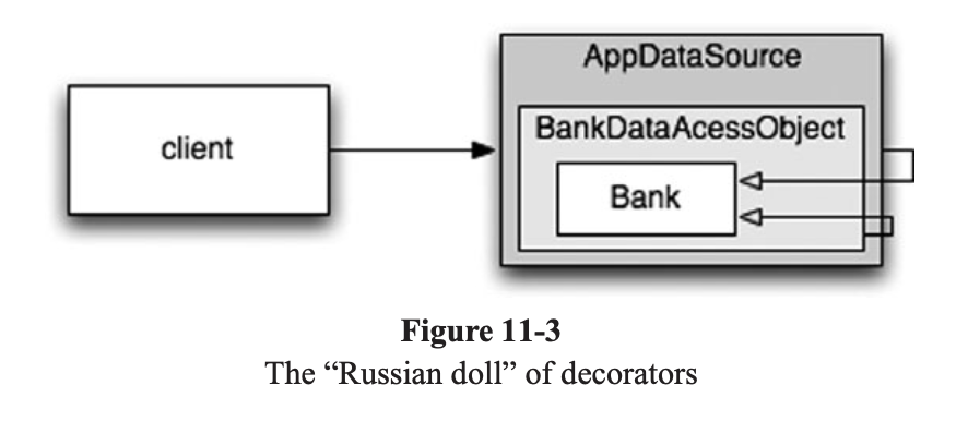 클라이언트는 Bank 객체에서 getAccounts()를 호출한다고 믿지만 실제로는 Bank POJO의 기본 동작을 확장한 중첩 DECORATOR 객체 집합의 가장 외곽 ( DAO -> JDBC )과 통신한다.