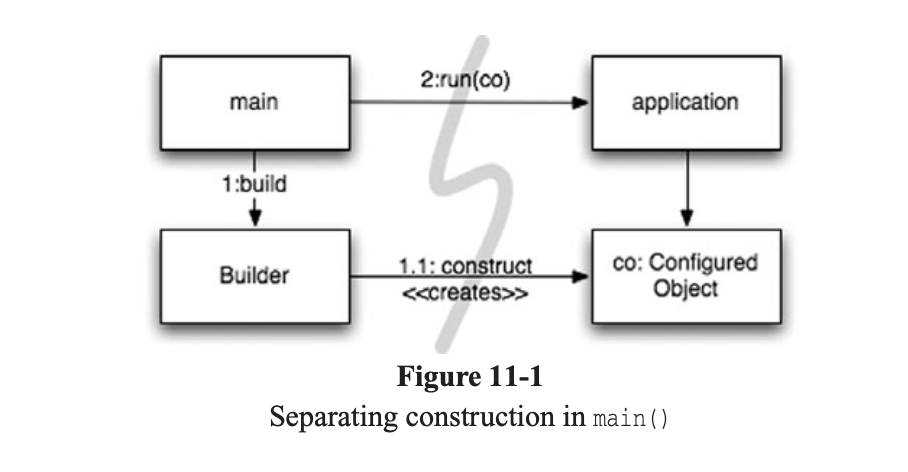 체계적이고 탄탄한 시스템을 만들고 싶다면 흔히 쓰는 좀스럽고 손쉬운 기법으로 모듈성을 깨서는 절대로 안 된다. 객체를 생성하거나 의존성을 연결할 때도 마찬가지다. 설정 논리는 일반 실행 논리와 분리해야 모듈성이 높아진다. 전반적이며 일관적인 방식도 필요하다.