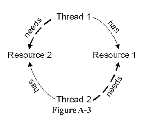 죽음의 포옹이라고도 한다. T1, T2라는 스레드 두 개가 있으며 R1, R2라는 자원 두 개가 있다고 가정하자. T1이 R1을 점유하고, T2가 R2를 점유한다. 또한 T1은 R2가 필요하고 T2도 R2가 필요하다. 그림으로 표현하면 아래와 같다.