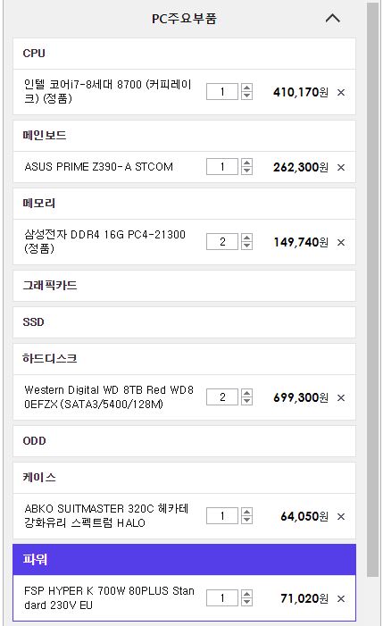 하지만, 부하가 큰 작업이 필요하지 않을 것으로 예상되고, 추후 서버 PC를 일반 용도로도 사용을 원하셔서, 일반 PC견적처럼 정하였다.